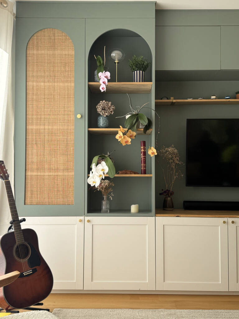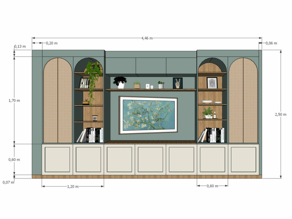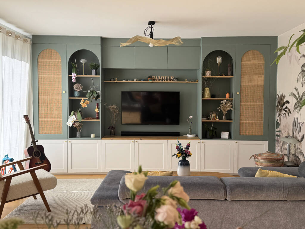 Après avoir échangé sur leurs inspirations, j’ai conçu le meuble avec des formes arrondies, du cannage, des étagères ouvertes et fermées.