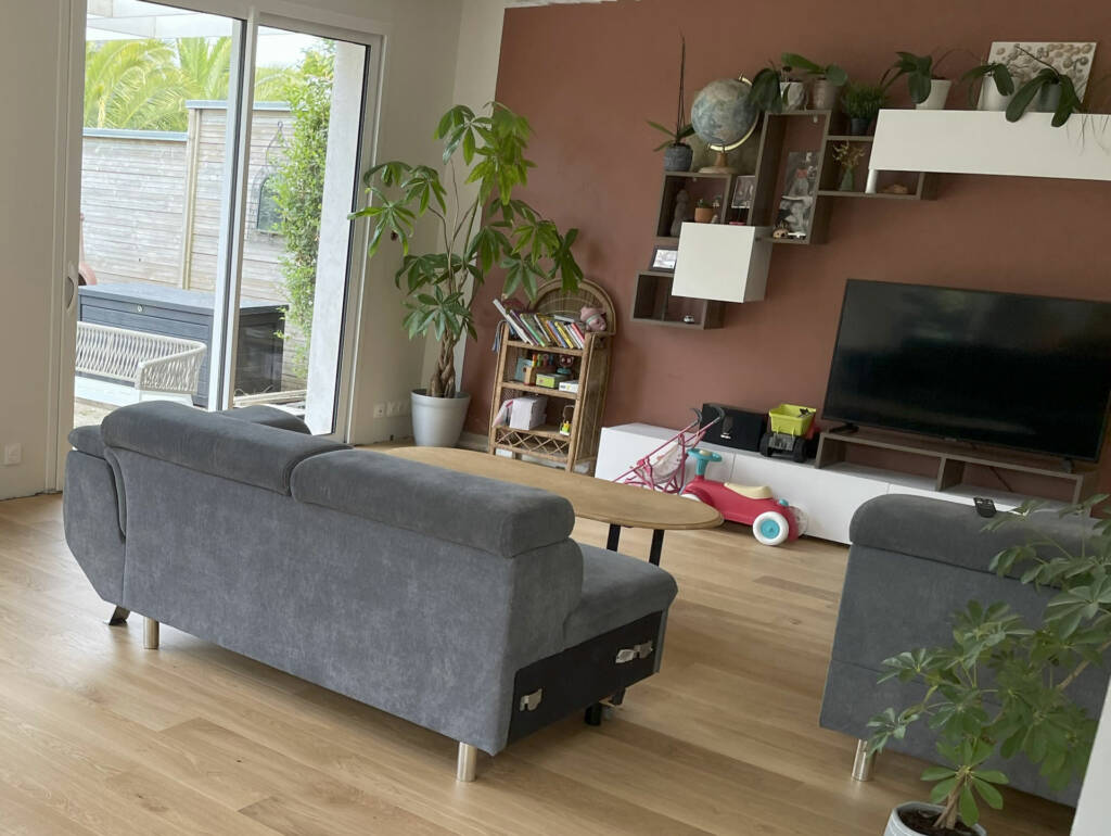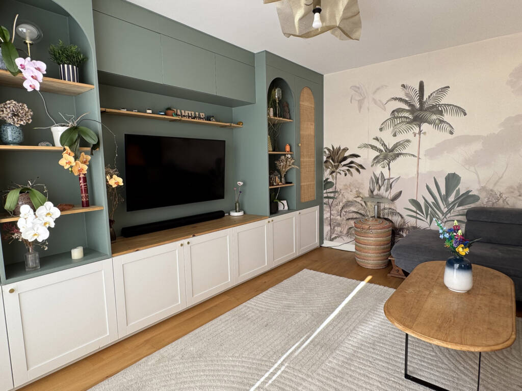 Chloé et Guillaume ont fait appel à mes services pour imaginer et dessiner un meuble TV sur-mesure dont ils rêvaient, associé à un papier peint panoramique.