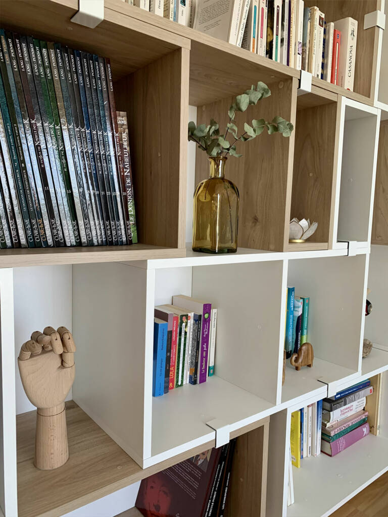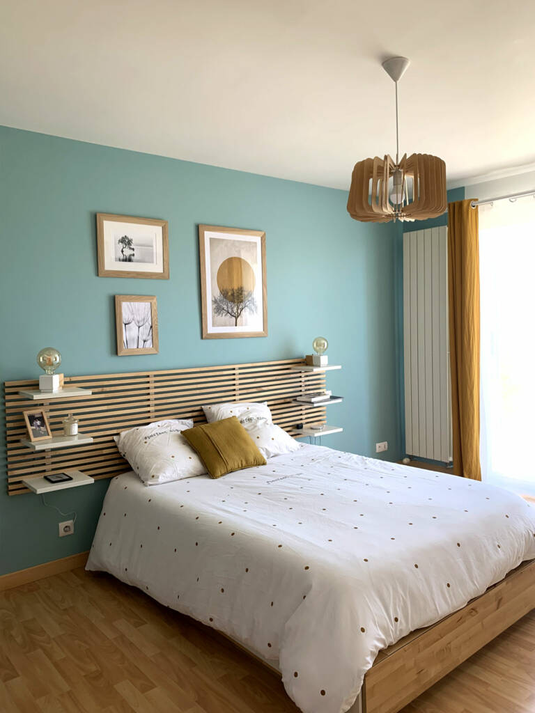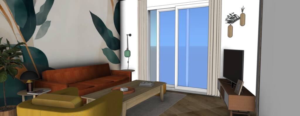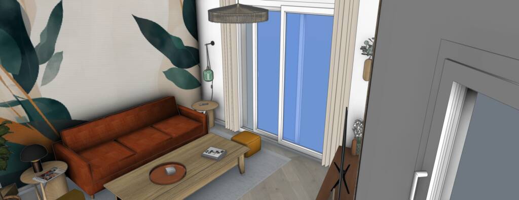 Le canapé d’angle trop imposant a laissé place à un canapé droit avec plusieurs assises d’appoint (fauteuil, pouf). Des éléments de déco ont été ajouter pour sublimer cet espace : rideau, lampe baladeuse, suspension, tables d’appoint, porte magazines et de la déco personnalisée.